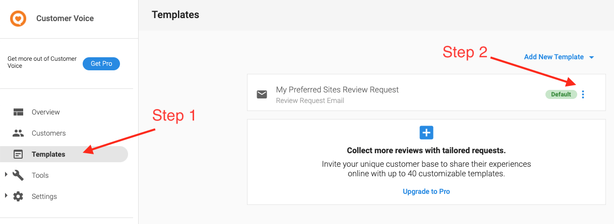 3. On the Customer Voice Module, Click Templates from the left side menu, then Click the 3 dots beside ‘Default’ on the ‘My Preferred Sites Review Request’ and select Edit Template.