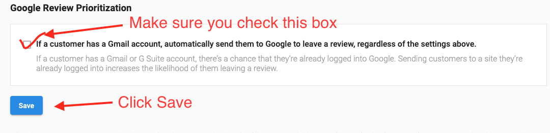 5. With your email template set up, click on Settings from the left side menu. Under Preferred sites, you should see Facebook and Google both checked if you have connected those accounts. I recommend checking the box for Google Review Prioritization as this will guide them to write a Google Review first. Click Save!