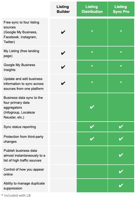 • Listing Sync: Quickly establish accurate business information on Google My Business, Facebook, Instagram, and Twitter for no additional charge. Own your business listings and keep your customers up-to-date.