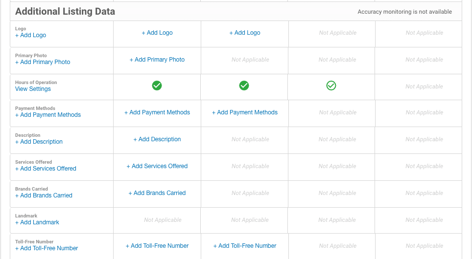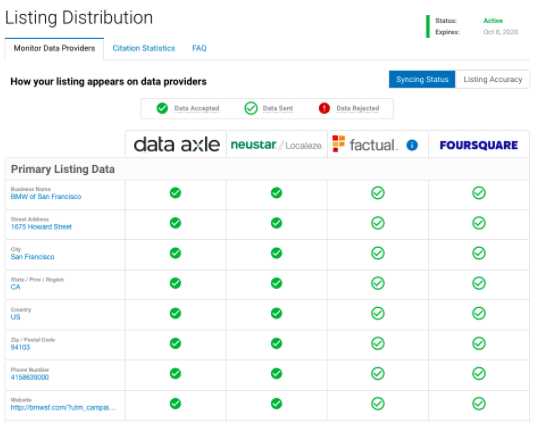 Listing Distribution gives you a single dashboard to submit, update, and monitor your business information across data aggregators: Neustar/Localeze, Foursquare, Data Axle, and Factual.