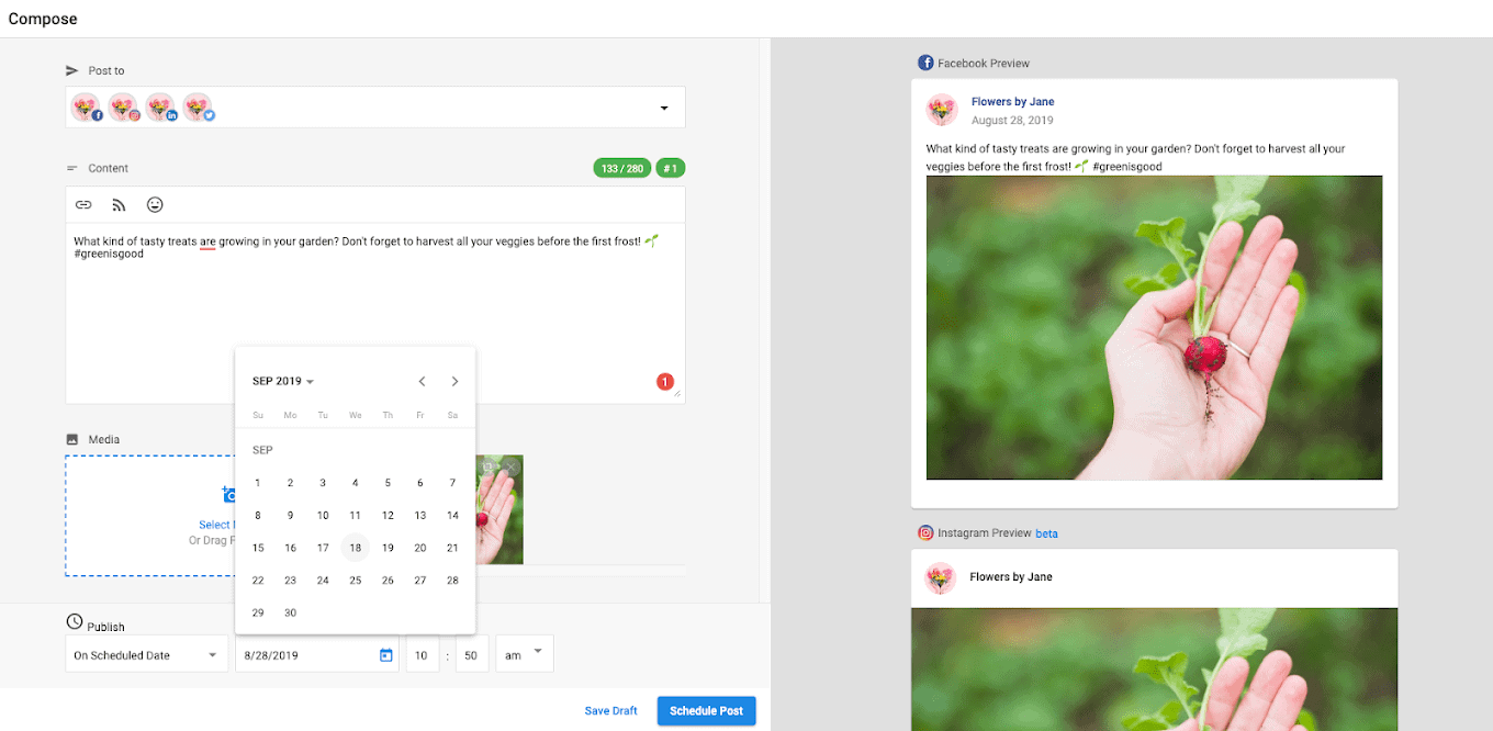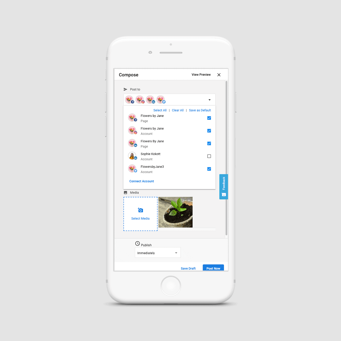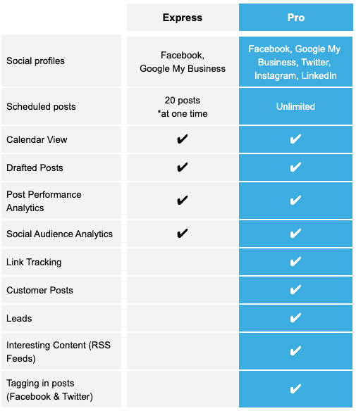 • All-in-one composer—Post to Facebook, Instagram, Twitter, Google My Business, Google+, and LinkedIn