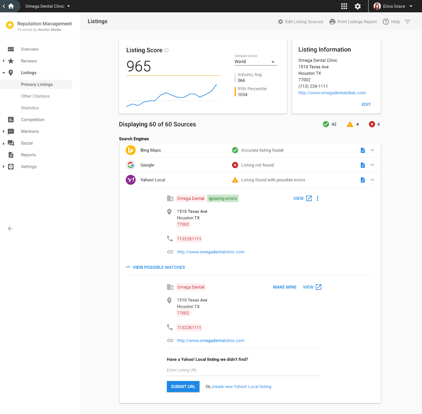 - Show up where people are looking: Improve your search rank by identifying online business listings that are inaccurate or missing from essential directories like Google, Facebook, and Bing.