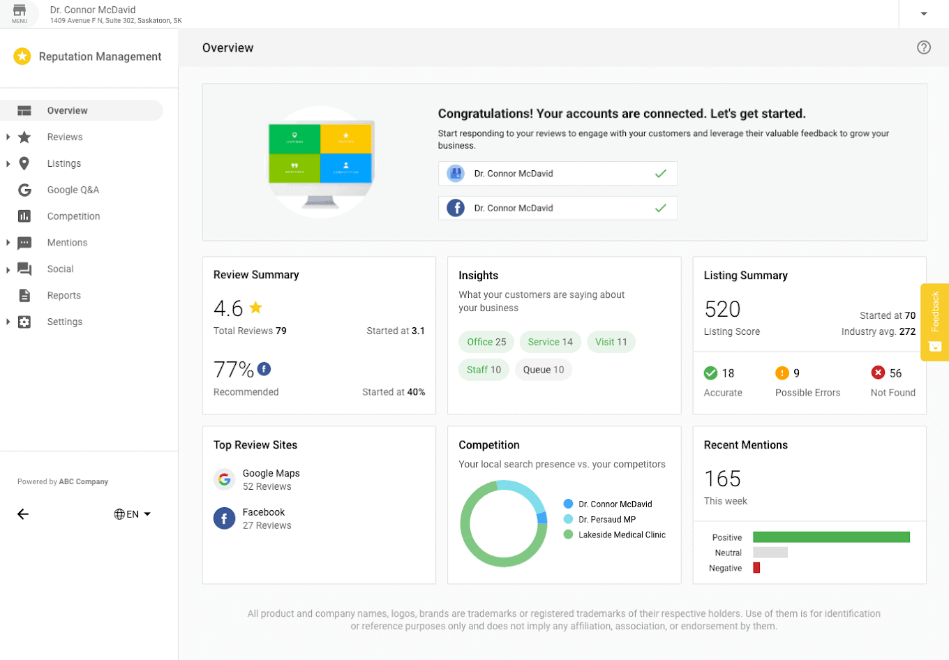Monitor what people are saying about you online and improve your visibility in local search. See how you stack up against the competition, stay in the know with automated alerts and get progress reports to see how your reputation has improved.