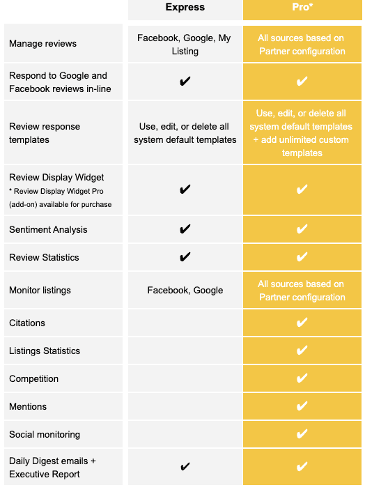 - Listing Sync: Quickly establish accurate business information on Google My Business, Facebook, Instagram, and Twitter for no additional charge. Own your business listings and keep your customers up-to-date.